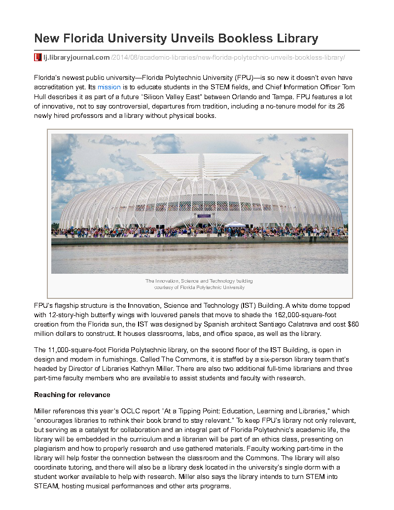 Reading: "New Florida University Unveils Bookless Library" Is this where we are headed? What do you know about libraries and research that supports or contradicts this trend? |